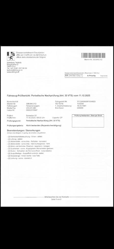 Das Fahrzeug wird verkauft ab Platz mit MFK Mängel, ohne Garantie und Gewährleistung. Siehe MFK Mängel Liste im Anhang (Fotos) MFK Mängel: - Kontrollschildbeleuchtung hinten defekt - Lüftung defekt - Abblendlicht vorne links Reflektor defekt - Abblendlicht vorne links Hell-Dunkelgrenze fehlt - Motor-und Getriebe, Ölverlust reparieren/reinigen - Querlenker vorne Kugelgelenk Manschette gerissen - Boden, Schwellern div. Korossion/Rost instandstellen - Auspuffanlage, Auspuffrohr Endrohr defekt - Stossstange hinten rechts lose Teile - Lenkung vorne klemmt zum teil