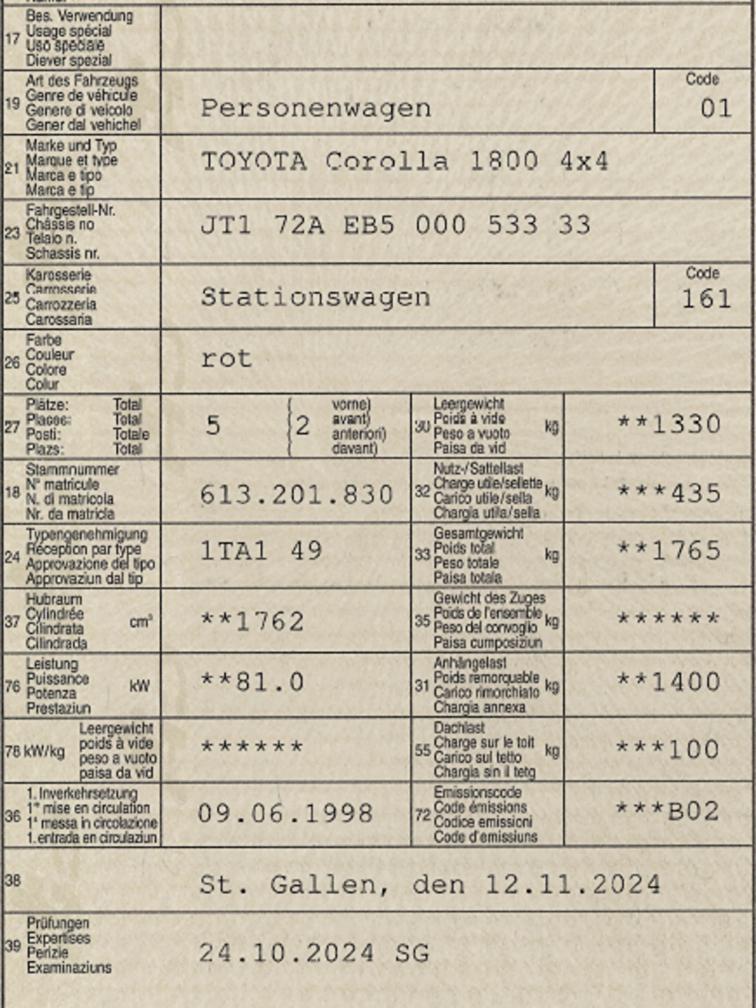 + Corolla 4x4 aus zweiter Hand + garantierte 135'000km + Gute Basis + Reparierter Rost + Fahrzeug stammt aus Privatbesitz + Radlager hinten links blockiert (bedingt fahrbar, sollte verladen werden) + 2.Schlüssel sollte vorhanden sein + Eventuell 8 fach vorhanden