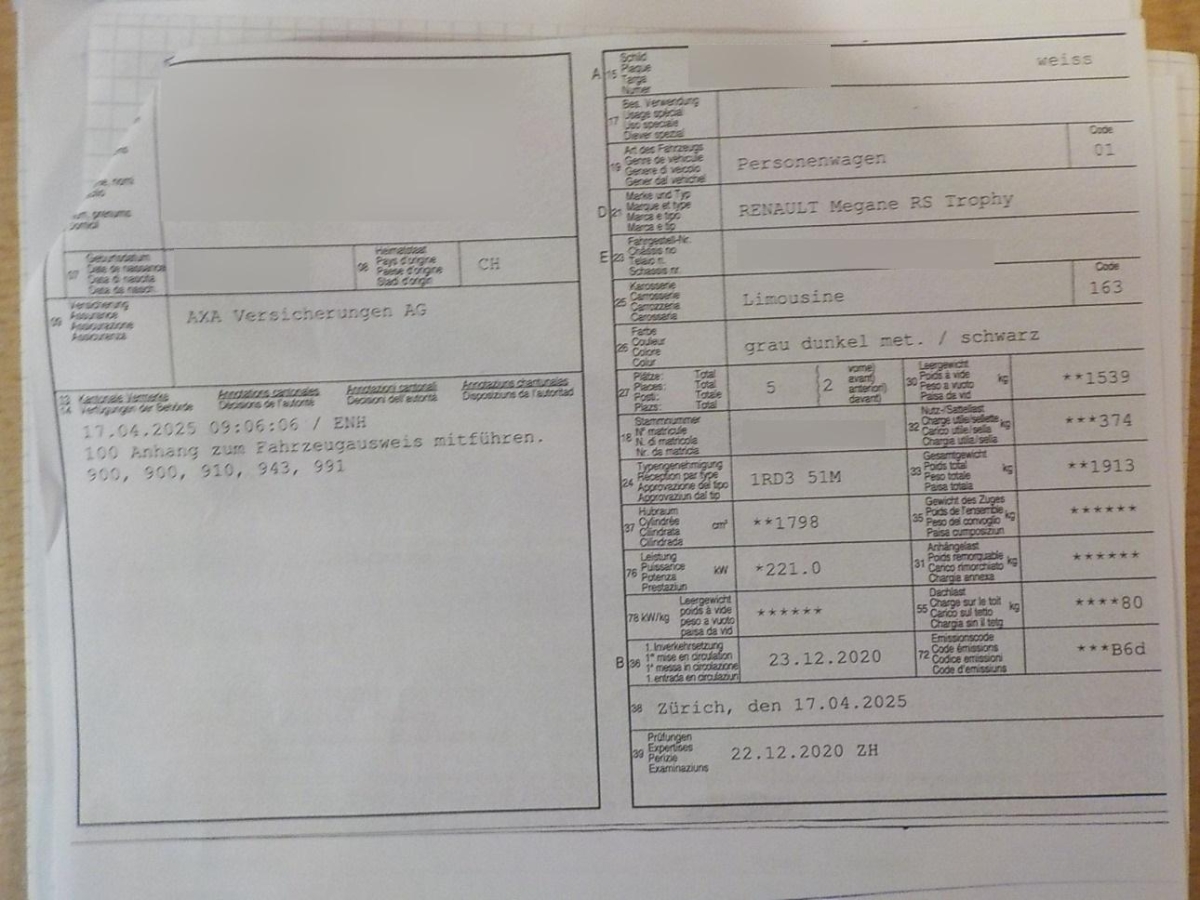Garantie: Renault Garantie 12 Jahre Durchrostungsgarantie, Dekor: Innenausstattung Noir, Heckscheibenheizung, Wegfahrsperre elektronisch, Stoßfänger vorne und hinten im spezifischen R.S. Design, Katalysator geregelt, 3-Punkt-Sicherheitsgurte auf allen Plätzen, Airbag: Autoadaptiver Fahrer- und Beifahrerairbag, Airbag: Frontairbag und Seitenairbag "Brust" auf Fahrer- und Beifahrerseite deaktivierbar, Airbag: Window-Kopfairbags vorne und hinten, Allradlenkung 4CONTROL mit 4 hydraulischen Druckanschlägen, Aluminium Pedale, Armlehnen vorne, Assist: ABS mit Notbremsassistent und Bremskraftverteilung, Assist: Automatische Notbremsung mit Fussgängererkennung, Assist: Automatischer Abstandsanzeiger, Assist: Einparkhilfe vorne und hinten mit Rückfahrkamera und Einparkhilfe 360, Assist: Elektronisches Stabilitätsprogramm (ESC) - Antriebsschlupfregelung (ASR) - Berganfahrhilfe, Assist: Spurhaltewarner, Assist: Tempomat mit Geschwindigkeitsbegrenzer, Assist: Tempowarnfunktion mit Verkehrszeichenerkennung, Automatische Parkbremse, Automatische Parkbremse, Automatisches Einschalten der Scheinwerfer und Scheibenwischer, Brembo-Bremsanlage, Connected Services, Dreipunktsicherheitsgurte mit Gurtkraftbegrenzer vorne und hinten, vorne in der Höhe verstellbar und mit Gurtstraffer, Dunkle Verglasung hinten, Elektrisch einklappbare Aussenspiegel, Elektrische Fensterheber vorne und hinten mit Schnellsenkfunktion, Fahrwerk: Cup-Fahrwerk, Fahrwerk: Mechanische TORSEN-Differentialsperre mit begrenztem Schlupf, Fahrwerk: Sport-Fahrwerk mit hydraulischem Endschlag an der Vorder- und Hinterachse., Garantie: Renault Garantie 3 Jahre Lackgarantie (ab 1. Inv.), Garantie: Renault Garantie 3 Jahre oder 100'000 km (ab 1. Inv.), Getriebe: Automatisiertes 6-Gang-Doppelkupplungsgetriebe, Gurtstraffer mit Gurtkraftbegrenzer vorne, Haifischantenne, Heckscheiben-Wisch-/Waschanlage, Heckspoiler, ISOFIX-Kindersitzverankerungen auf den hinteren Aussensplätzen, Keyless Drive Hands-free, Klima: Zweizonen-Klimaautomatik, Lenkrad: Lenkrad in Höhe und Tiefe verstellbar, Lenkrad: Lenkrad mit Schaltwippen, Lenkrad: Sportlenkrad in Alcantaraleder, Licht: Voll-LED Scheinwerfer LED Pure Vision und Tagfahrlicht vorne, MULTI-SENSE mit Licht-Ambiente, Media: 10,2-Zoll-TFT-Kombiinstrument, Media: Integriertes, multifunktionales Multimediasystem EASY LINK - mit Bose Premium-Audiosystem, 9 Lautsprecher mit 9.3-Zoll TouchscreenNavigation mit Europakarte, Media: Navigation mit Europakarte, Media: Smartphone-Replikation Apple CarPlay und Android Auto, Mittelarmlehne hinten, Pollenfilter (Staubfilter), Rahmenloser Innenspiegel automatisch abblendbar, Rote Bremssättel, Räder: 19" Alufelgen Design Jerez chrom schwarz mit roter Verzierung, Räder: Reifenreparatur-Set (Tire Fit), Schalthebelknauf in Leder, Servolenkung geschwindigkeitsabhängig, Sitze: Beheizbare Vordersitze, Sitze: Fahrersitz in der Höhe verstellbar, Sitze: Fahrersitz mit verstellbarer Lendenstütze, Sitze: Sportsitze mit Alcantarapolsterung R.S. in Titanium Black und roten Ziernähten, Smartphone Control, Sonnenblenden mit beleuchtetem Schminkspiegel, Sport-Abgasanlage mit Klappensteuerung, Stossfänger hinten mit Diffusor und zentralem Abgasendrohr, Zentralverriegelung der Türen, der Heckklappe und des Tankdeckels