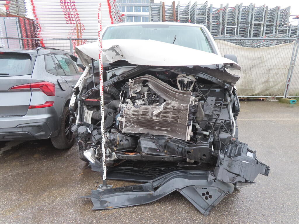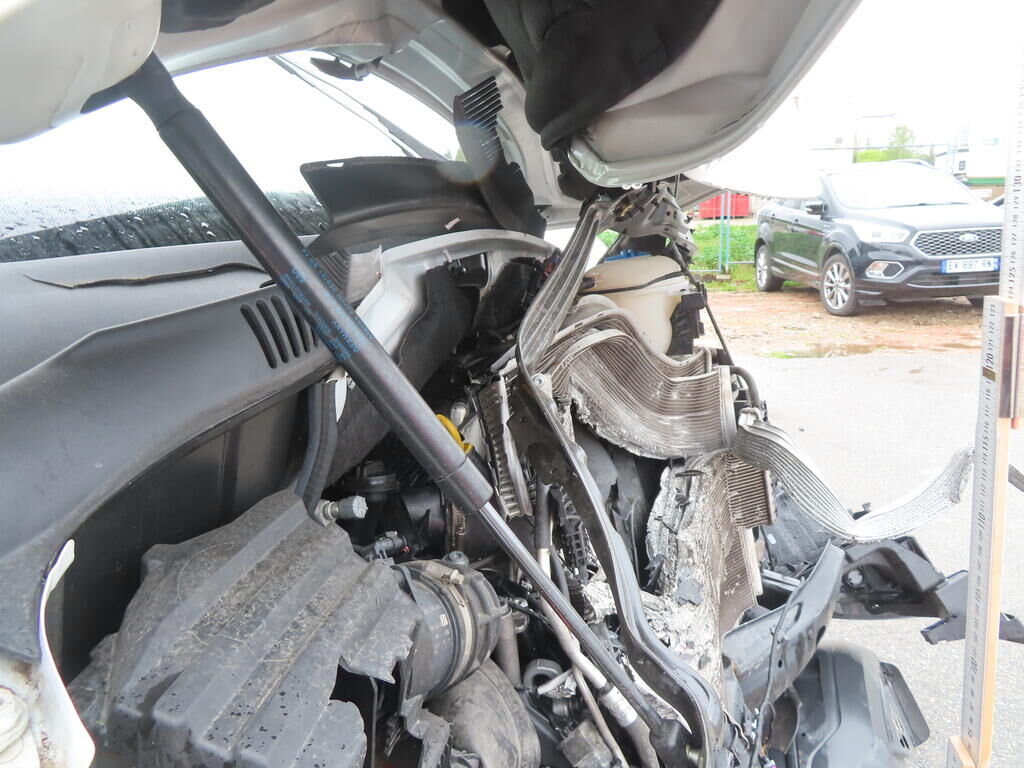 Choc avant: Bloc avant enfoncé et plié. Moteur reculé. (IMPORTANT: RISQUE SUR LE MOTEUR.) Airbags et rétracteur de ceinture déclenchés. Motor Getriebe Vorderachse Hinterachse Airbags ausgelöst: 2 unbekannt ( Abfallcode 16.01.04ak )
