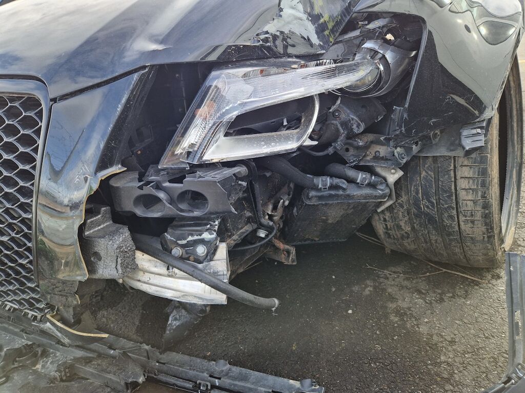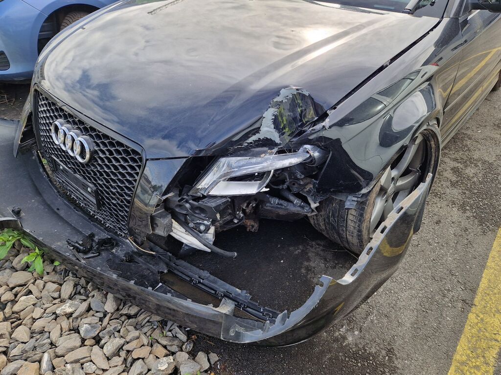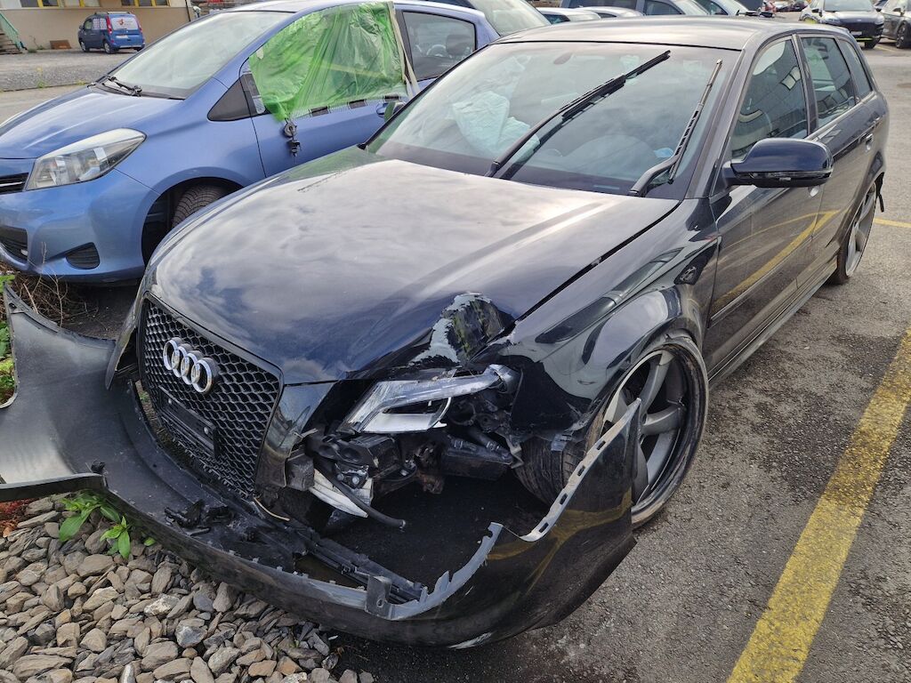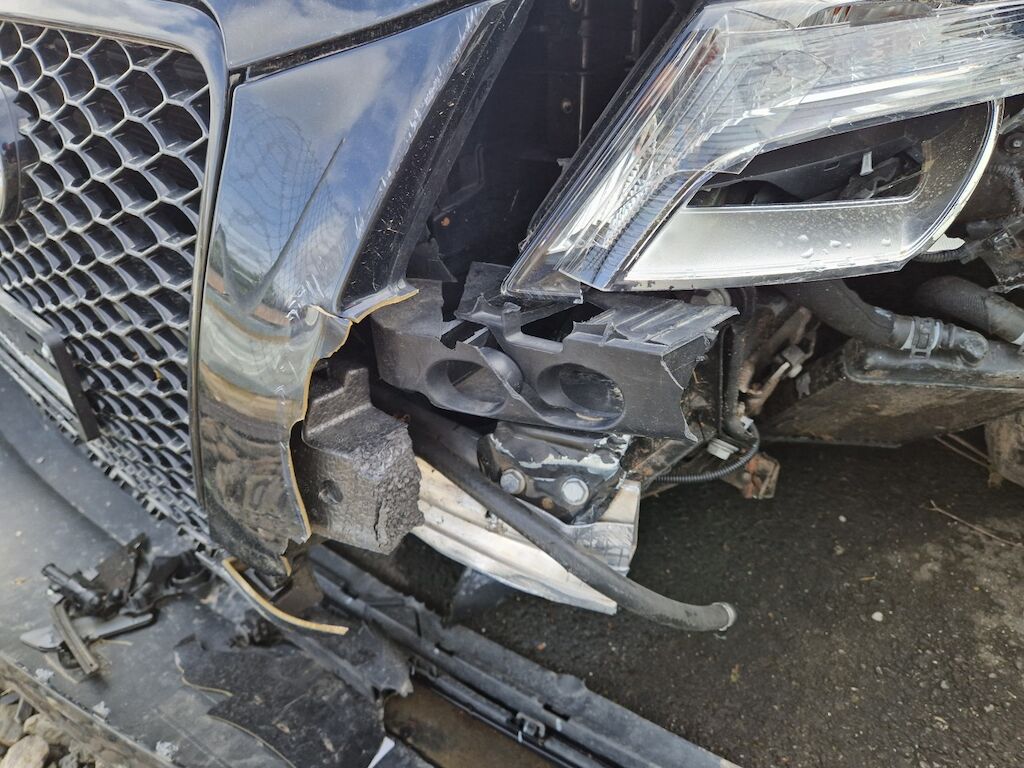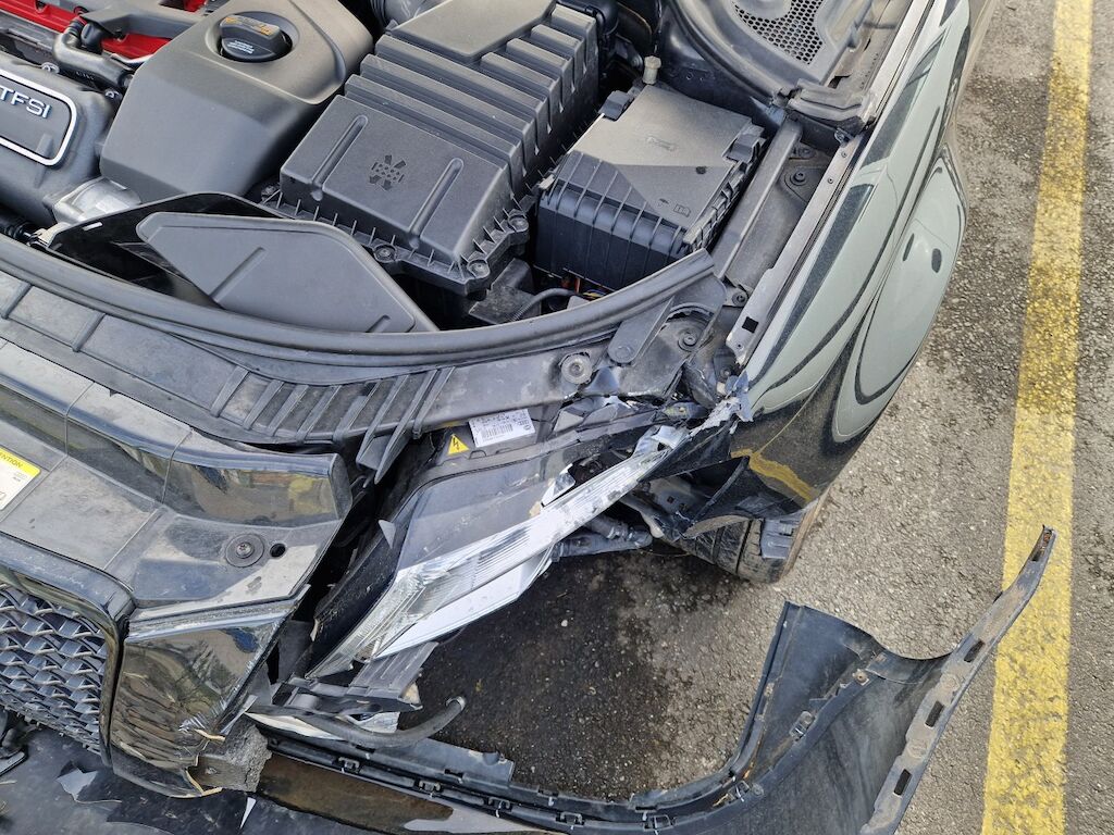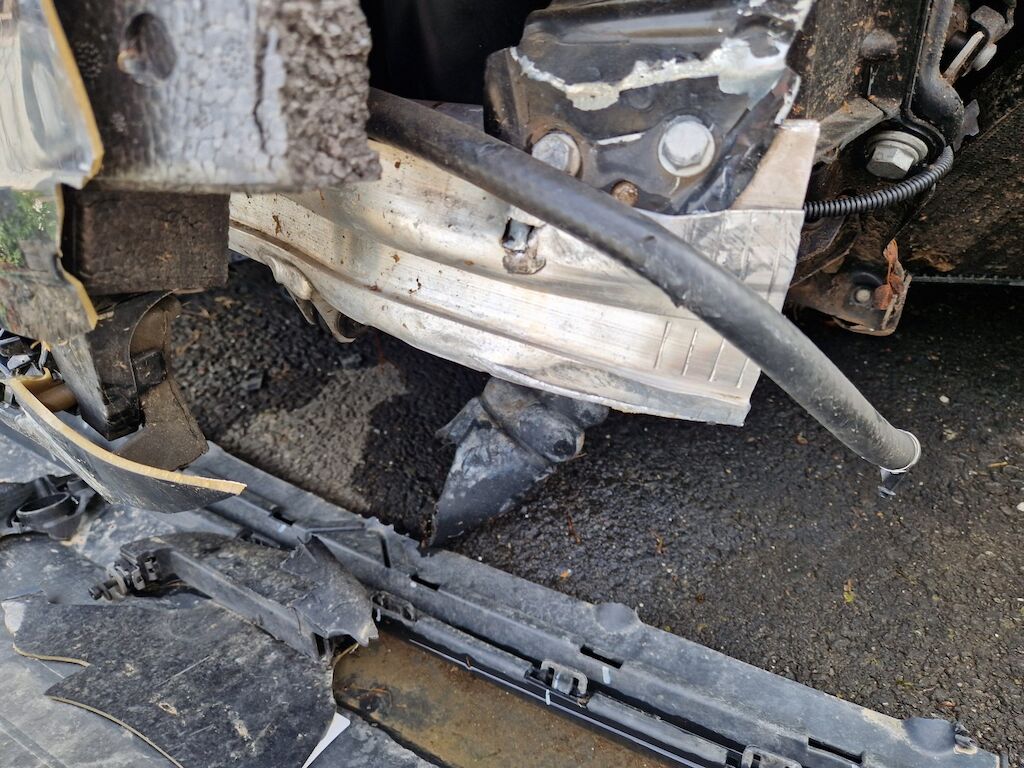 important choc: pare-choc avant, calandre, spoiler, phare gauche cassé, capot moteur enfoncé, aile avant gauche refoulée, mécanique avant gauche refoulée contre montant A , mécanique avant gauche à remplacer, direction à remplacer, joue d'aile gauche pliée, embout de longeron gauche plié, porte avant gauche marquée, aile avant droite pliée, jante et pneu avant droite endommagé, mécanique arrière gauche pliée, jante arrière droite pliée, pare-choc arrière arraché, air bag / passager activés, pare brise cassé, voir détail calcul dans le dossier Motor Getriebe Vorderachse Hinterachse Airbags ausgelöst: 4 Ja ( Abfallcode 16.01.04ak )