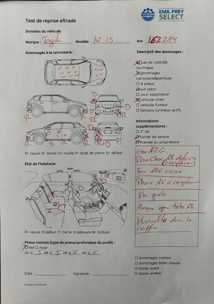Pas de contrôle technique (essai en atelier) effectué Dommages divers à la carrosserie/à la peinture. C'est un véhicule pour chien. Voiture grêlée. Choc ARG, pare-chocs ARR à remplacer. Feu ARG cassé. Phares AV à remplacer. Manque appui-tête ARR. Humidité dans le coffre. Véhicule dès site, sans garantie et sans préparation. Motor Getriebe Vorderachse Hinterachse Airbags ausgelöst: 0 Nein ( Abfallcode 16.01.04ak )
