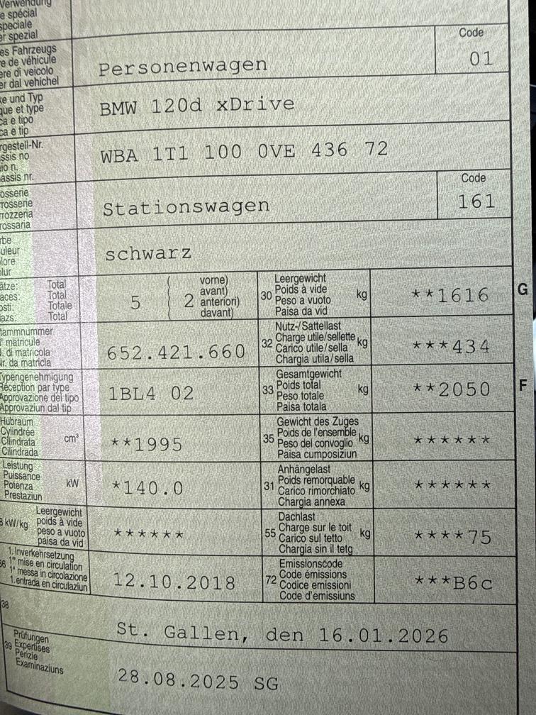 Fahrzeug in Betrieb und wird gefahren, keine Probleme bekannt, Parkschaden rechte Seite ( siehe Foto ) Cat Code Bezeichung Preise inkl. MwSt. 7.7% M 1T11 120d xDrive 44700.00 P 0475 BLACK SAPPHIRE METALLIC 990.00 F LCRY LEDER DAKOTA/COGNAC/AKZENT BRAUN(SW 2310.00 S 0164 ABGASTECHNIK EU6 0.00 S 01CA SELEKTION COP RELEVANTER FAHRZEUGE 0.00 S 020W 18"M LMR.DO.SPEI. 719 M BI.JET. 250.00 S 0216 SERVOTRONIC 0.00 S 0230 EU SPEZIFISCHE ZUSATZUMFAENGE 0.00 S 0249 MULTIFUNKTION FUER LENKRAD 0.00 S 0258 BEREIFUNG MIT NOTLAUFEIGENSCHAFTEN 0.00 S 02PA RADSCHRAUBENSICHERUNG 0.00 S 02TB SPORT-AUTOMATIK GETRIEBE 190.00 S 02VB REIFENDRUCKANZEIGE 0.00 S 0302 ALARMANLAGE 0.00 S 0322 KOMFORTZUGANG 370.00 S 03AG RUECKFAHRKAMERA 510.00 S 0413 GEPAECKRAUMTRENNETZ 240.00 S 0423 FUSSMATTEN IN VELOURS 0.00 S 0428 WARNDREIECK 0.00 S 0430 INNEN- UND AUSSENSPIEGELPAKET 620.00 S 0431 INNENSPIEGEL,AUTOMATISCH ABBLENDEND 210.00 S 0459 SITZVERSTELLUNG, ELEKTR.MIT MEMORY 1210.00 S 0465 DURCHLADESYSTEM 250.00 S 0481 SPORTSITZE FUER FAHRER/BEIFAHRER 0.00 S 0488 LORDOSENSTUETZE FAHRER/BEIFAHRER 290.00 S 0493 ABLAGENPAKET 0.00 S 0494 SITZHEIZUNG FUER FAHRER/BEIFAHRER 0.00 S 04AE ARMAUFLAGE VORNE VERSCHIEBBAR 0.00 S 04LU INT.L.SCHW.HOCHGL.M.AKZENT.L.PERLGL 0.00 S 0508 PARK DISTANCE CONTROL (PDC) 250.00 S 0521 REGENSENSOR 0.00 S 0534 KLIMAAUTOMATIK 700.00 S 0544 GESCHWINDIGKEITSREGEL. MIT BREMSF. 0.00 S 0548 KILOMETERTACHO 0.00 S 0552 ADAPTIVER LED-SCHEINWERFER 620.00 S 0563 LICHTPAKET 0.00 S 05A1 LED-NEBELSCHEINWERFER 0.00 S 05AC FERNLICHTASSISTENT 170.00 S 05DA BEIFAHRERAIRBAG-DEAKTIVIERUNG 0.00 S 05DC FONDKOPFSTUETZEN KLAPPBAR 0.00 S 05DP PARKASSISTENT 190.00 S 0609 NAVIGATIONSSYSTEM PROFESSIONAL 2600.00 S 0654 DAB TUNER 0.00 S 0676 HIFI LAUTSPRECHERSYSTEM 370.00 S 0698 AREA-CODE 2 0.00 S 06AC INTELLIGENTER NOTRUF 0.00 S 06AE TELESERVICES 0.00 S 06AK CONNECTEDDRIVE SERVICES 0.00 S 06AM REAL TIME TRAFFIC INFORMATION 200.00 S 06AN CONCIERGE SERVICES 320.00 S 06AP REMOTE SERVICES 0.00 S 06NW TELEFONIE MIT WIRELESS CHARGING 510.00 S 06UH TRAFFIC INFORMATION 0.00 S 06WA INSTRUMENTENKOMBI. M. ERW. UMF. 190.00 S 06WD WLAN HOTSPOT 0.00 S 0710 M LEDERLENKRAD 0.00 S 0715 M AERODYNAMIKPAKET 0.00 S 0760 M HOCHGLANZ SHADOW LINE 0.00 S 0775 M DACHHIMMEL ANTHRAZIT 0.00 S 07B3 EDITION M SPORT 5140.00 S 0851 SPRACHVERSION DEUTSCH 0.00 S 0879 DEUTSCH / BORDLITERATUR 0.00 S 08KA OELWARTUNGSINT. 30.000KM/24MONATE 0.00 S 08R9 KAELTEMITTEL 0.00 S 09AA AUSSENHAUTSCHUTZ 0.00 Total Sonderausstattung 18700.00 Total Neupreis 63400.00