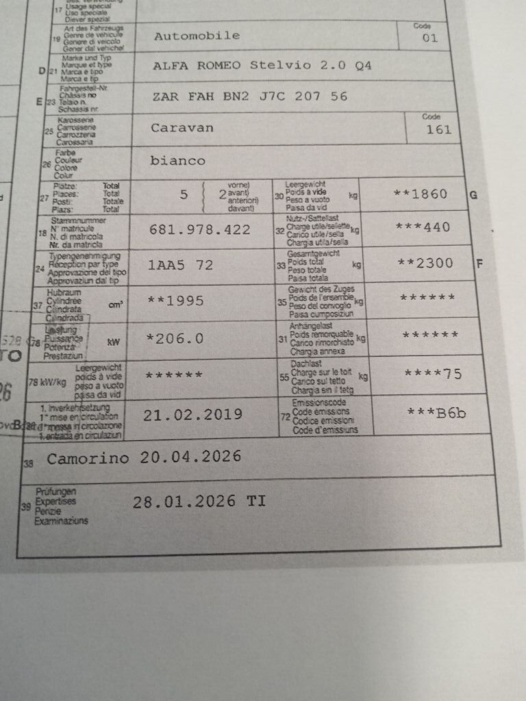 Non è stata effettuata alcuna ispezione tecnica (prova in officina) VEICOLO COLLAUDATO 01.2026 Otto pneumatici Piccolo danno paraurti posteriore centrale Rivestimento interno portellone leggermente graffiato Motor Getriebe Vorderachse Hinterachse Airbags ausgelöst: 0 Nein ( Abfallcode 16.01.04ak )