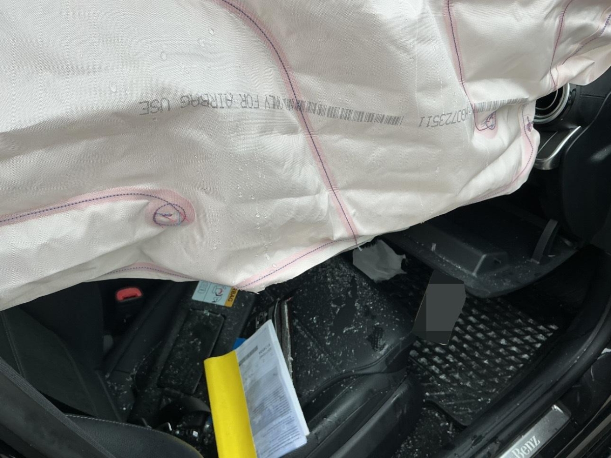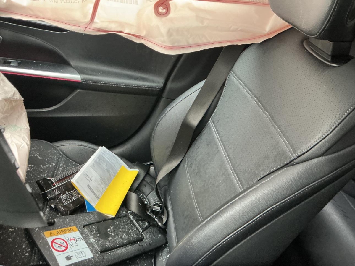 A-Säule, Achsträger, Airbag ausgelöst, Armaturenbrett, Dach, Front, Frontscheibe, Gurtstraffer ausgelöst, Rad hinten rechts