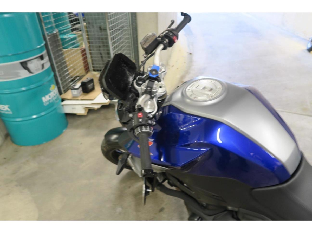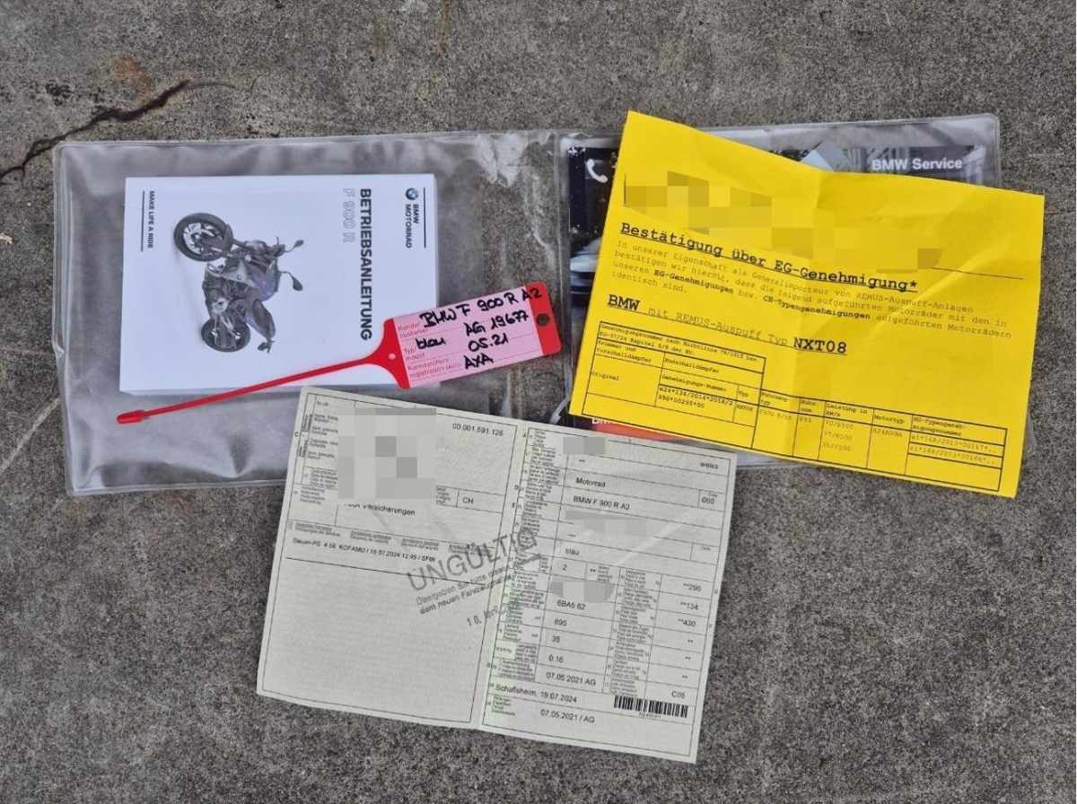 Armaturen, Auspufftopf, Aussenspiegel links, Aussenspiegel rechts, Diverse Anbauteile, Front, Fussraster rechts, Gabelholm, Griff rechts, Heck, Lenkanschlag, Lenker, Rad vorne, Scheinwerfer, Schutzblech vorne, Schwinge, Seite rechts, Verschalungen rechts, Verschalungen vorne, Windschutzscheibe