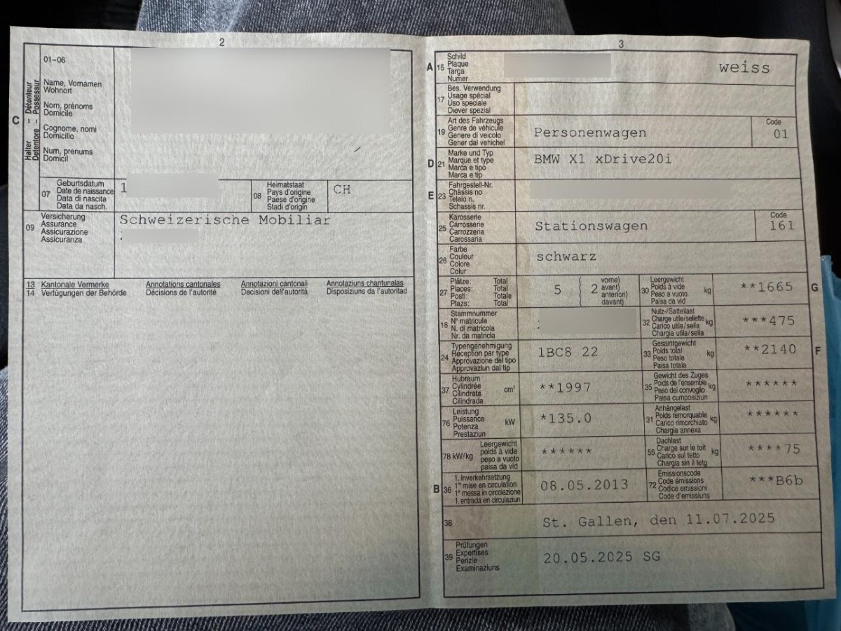 Cupholder, Bremsenergie-Rückgewinnung, 3 Kopfstützen hinten, Licht: Drittes Bremslicht LED, Dynamische Bremsleuchten, Check-Control-System, Airbag: Seitenairbag für Fahrer und Beifahrer, Window-Kopfairbags, 6 Lautsprecher, Airbag: Airbag Fahrer und Beifahrer, Dekor: Interieurleisten in Satinsilber matt, Lenkrad: Lenkrad längs- und höhenverstellbar, Wegfahrsperre elektronisch, Einstiegsschienen, AUX-Anschluss, Bordcomputer, Allradantrieb permanent, Antiblockiersystem (ABS), Reifendruckverlust-Warnsystem, LED Blinker im Aussenspiegel, Verbandskasten, Stoff-Ausstattung Elektra, Klima: Klimaanlage, Gangempfehlung, Elektrische Lenkung (EPS), Sicherheitstrennnetz oder /-gitter im Gepäckraum, Rücksitzlehne geteilt abklappbar, Abschliessbare Radschrauben, Start-/Stop-Knopf, Radio BMW Business CD, Elektrische Fensterheber vorne + hinten, Katalysator geregelt, Aussenspiegel rechts und links beheizbar und elektrisch verstellbar, 3 Speichen-Lederlenkrad, Automatische Stabilitäts-Control (ASC), Airbag: Airbag Beifahrer deaktivierbar, Veloursfussmatten vorne und hinten, Vordersitze höhenverstellbar, Licht: Heckleuchten in LED-Technik - einteilige LED-Heckleuchten mit Rauchglas Komponenten - Heckleuchte mit Schlusslicht, Bremslicht, Fahrtrichtungsanzeiger (LED-Technologie), Leichtmetallfelgen im Sternspeichen- design 317 17J mit Pneu, Assist: Dynamische Traktionskontrolle (DTC), Assist: Crash-Sensor, Bremsassistent (BAS), Tagfahrlicht, Aktive Kopfstützen, Anfahrassistent, Bremsbelag-Verschleissanzeige, Dynamische Stabilitätskontrolle (DSC), Make up-Spiegel links, 8-Stufen-Automat sequentiell, Wärmeschutzverglasung, Zentralverriegelung mit Fernbedienung, ISOFIX Kindersitzvorrichtung, Nebelscheinwerfer, Make up-Spiegel rechts, Lackierung: Uni-Lackierung, Lenkung, elektrisch unterstützt, Leuchtweitenregulierung elektrisch, Hochgeschwindigkeitsabstimmung, Assist: Cornering Brake Control (CBC)