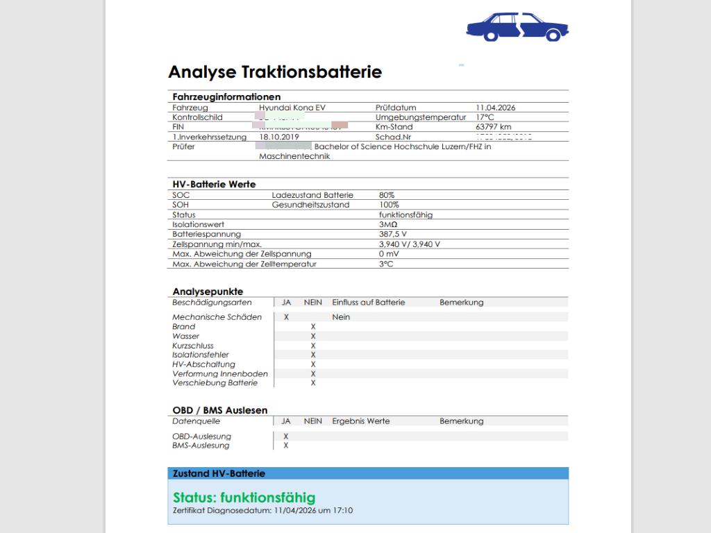 Die Hochvoltbatterie wurde geprüft und ist funktionsfähig. Das Fahrzeug wird mit der geprüften HV-Batterie verkauft.Die (vom Fahrzeugexperten) ermittelten Reparaturkosten beziehen sich auf das versicherte Ereignis. Allfällige zusätzliche, nicht versicherte Schäden/Vorschäden, sind in den Reparaturkosten nicht enthalten. Die deklarierten Ausstattungsmerkmale können von der effektiven Ausstattung abweichen.AchtungBei einem Hochvoltsystem - Spannungsfreiheit prüfen. Sicherheitshinweise und Betriebsanleitungen des Herstellers konsultieren und befolgen.