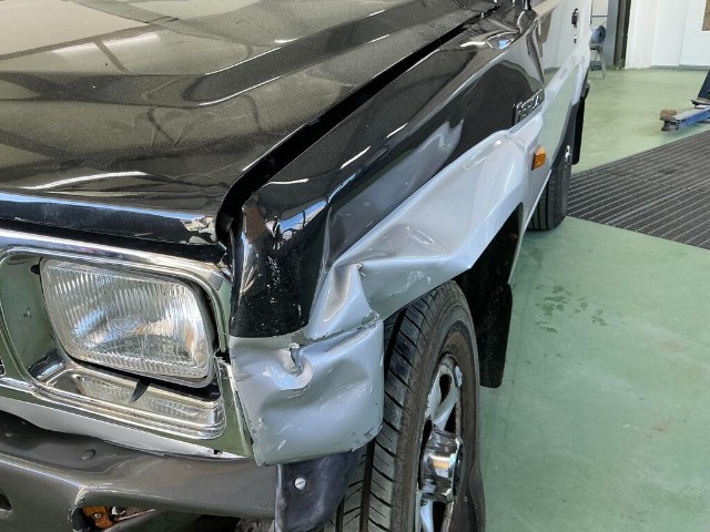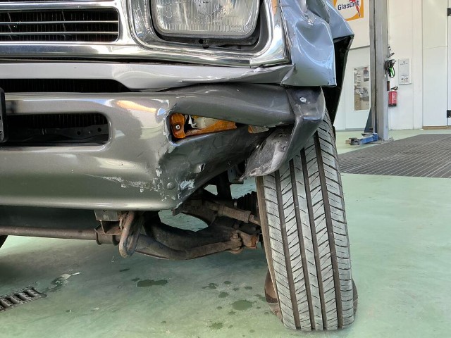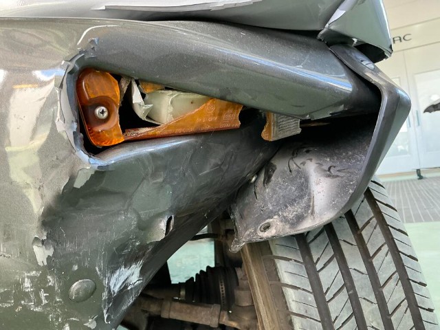 Linker vorderer Kotflügel ist verbogen. Frontstoßstange, vorderer Kotflügel, vordere Kotflügelverkleidung und Motorhaube sind eingedrückt. Kühlergrill der Frontstoßstange ist gebrochen. Linke Vordertür ist zerkratzt. Vorderradaufhängung links ist stark verschoben.