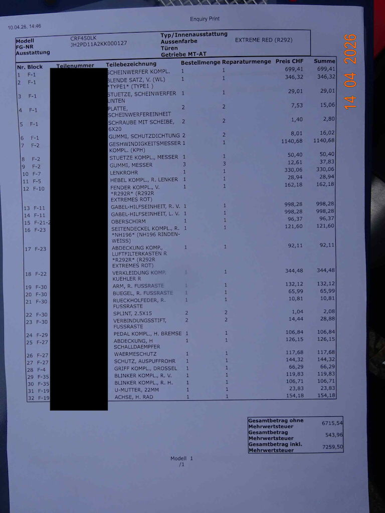 Motorrad gestürzt und mit Fahrzeug kollidiert.Genauer Kilometerstand konnte nicht abgelesen werden, gemäss Fahrzeughalter ca. 1400kmDetaillierte ET-Liste als Foto im Anhang.Risiko:Unzerlegt, siehe FotosHA-SchwingeVorschäden:EndschalldämpferendkappeDiverse Gebrauchsspuren dem Alter und der Laufleistung entsprechendSonder- und Serienausstattung siehe Anhang