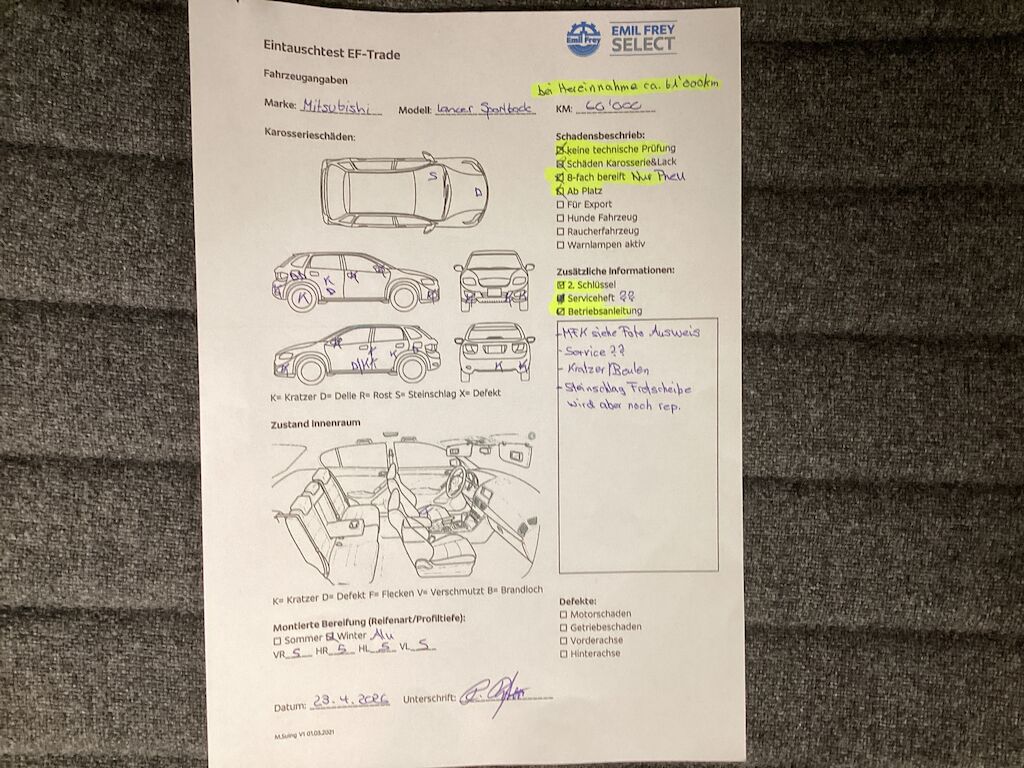 MFK siehe Foto AusweisService ???Kratzer und BeulenSteinschlag Frontscheibe wird noch durch Kunde rep.Kilometerstand bei Hereinnahme Datum ca 61000km