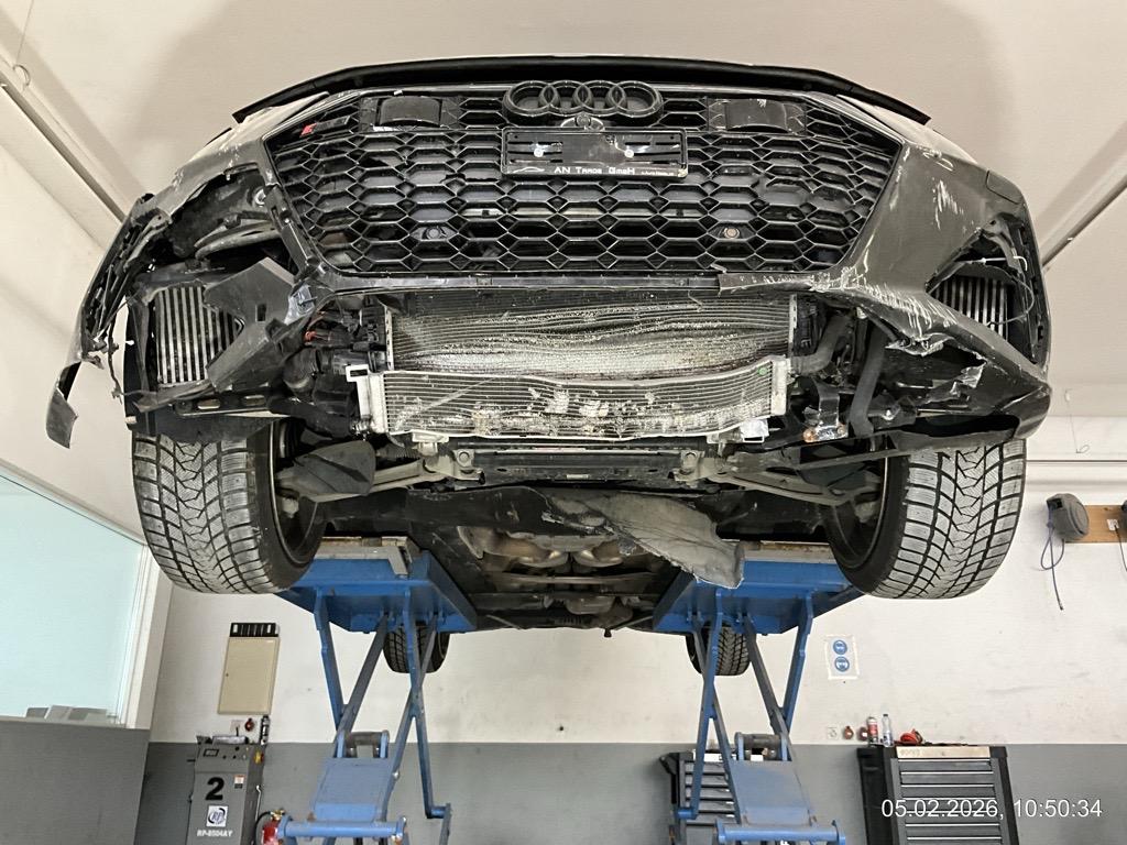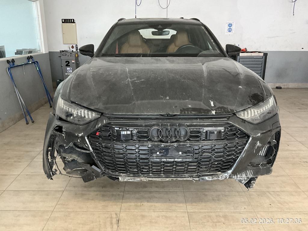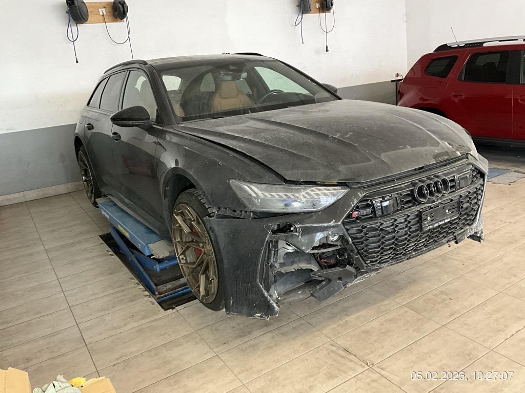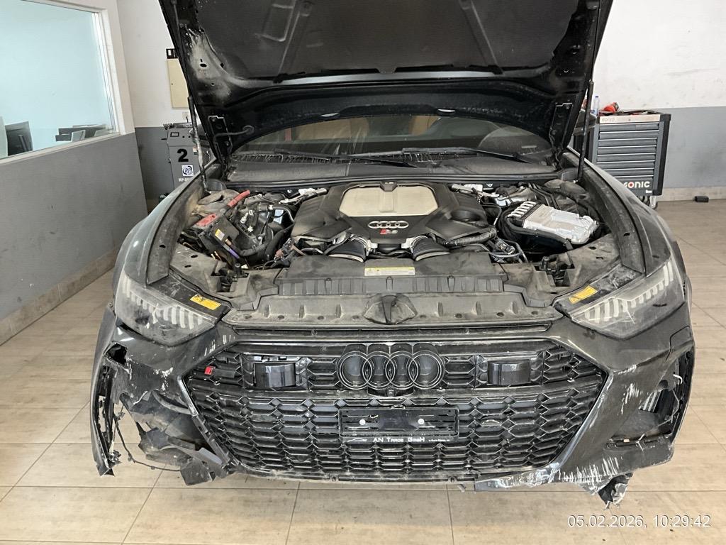 Front-/ und Heckschaden - Front: Motorhaube, Stossstange, Front unten innen alles eingedrückt, alle Kühler eingedrückt - AUFZÄHLUNG NICHT ABSCHLIESSEND / Heck: Stossstange, Heckklappe, Heckscheibe und Seitenwand hinten mitte/rechts eingedrückt. Boden und Auspuffanlage gestaucht - AUFZÄHLUNG NICHT ABSCHLIESSEND / Unfallhergang: ein LKW ist in das Heck des parkierten RS6 gefahren und hat diesen gegen eine Steinmauer geschoben. Motor läuft, das Fahrzeug ist fahrbar. Aber sicher Risiko Motor, Getriebe und weitere verdeckte Schäden. Kalkulation und Schadenaufnahme aber auf dem Lift gemacht. / Vorbestandene Schäden: Felge hinten rechts wurde geschweisst (im Ausland). Vorne mitte: Steinschlag
