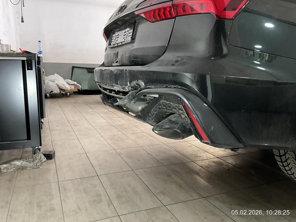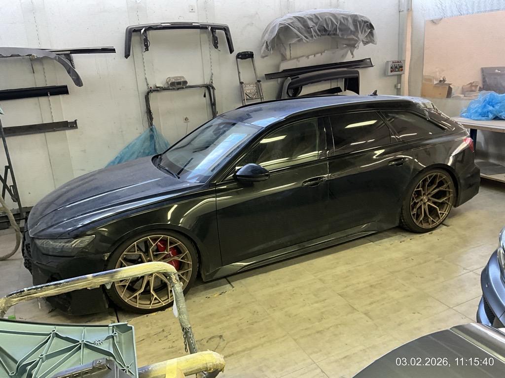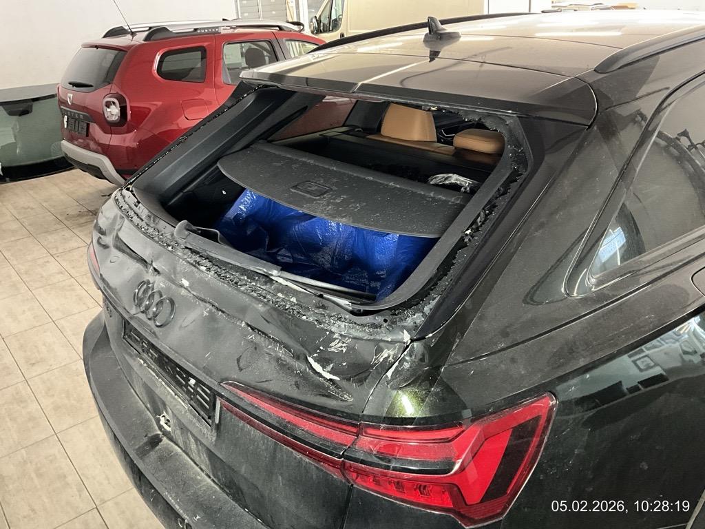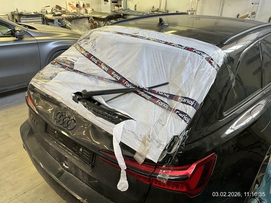 Front-/ und Heckschaden - Front: Motorhaube, Stossstange, Front unten innen alles eingedrückt, alle Kühler eingedrückt - AUFZÄHLUNG NICHT ABSCHLIESSEND / Heck: Stossstange, Heckklappe, Heckscheibe und Seitenwand hinten mitte/rechts eingedrückt. Boden und Auspuffanlage gestaucht - AUFZÄHLUNG NICHT ABSCHLIESSEND / Unfallhergang: ein LKW ist in das Heck des parkierten RS6 gefahren und hat diesen gegen eine Steinmauer geschoben. Motor läuft, das Fahrzeug ist fahrbar. Aber sicher Risiko Motor, Getriebe und weitere verdeckte Schäden. Kalkulation und Schadenaufnahme aber auf dem Lift gemacht. / Vorbestandene Schäden: Felge hinten rechts wurde geschweisst (im Ausland). Vorne mitte: Steinschlag