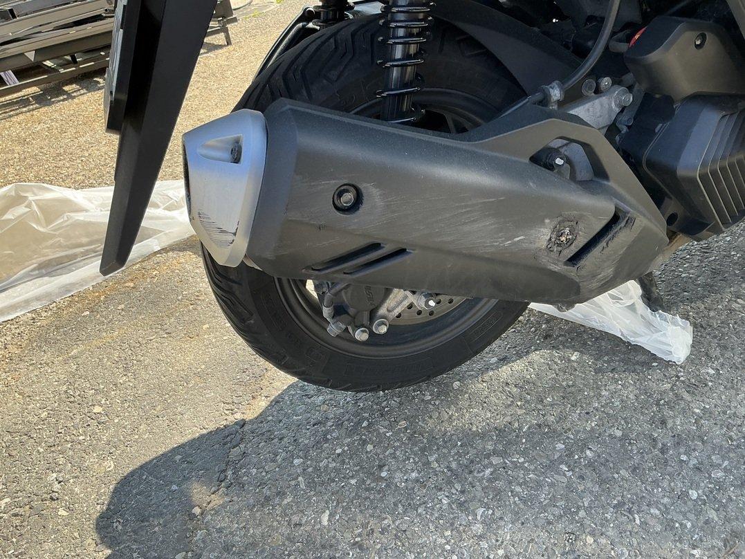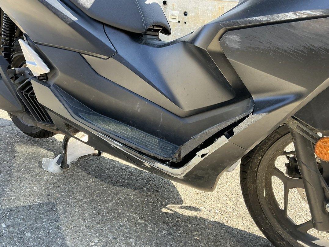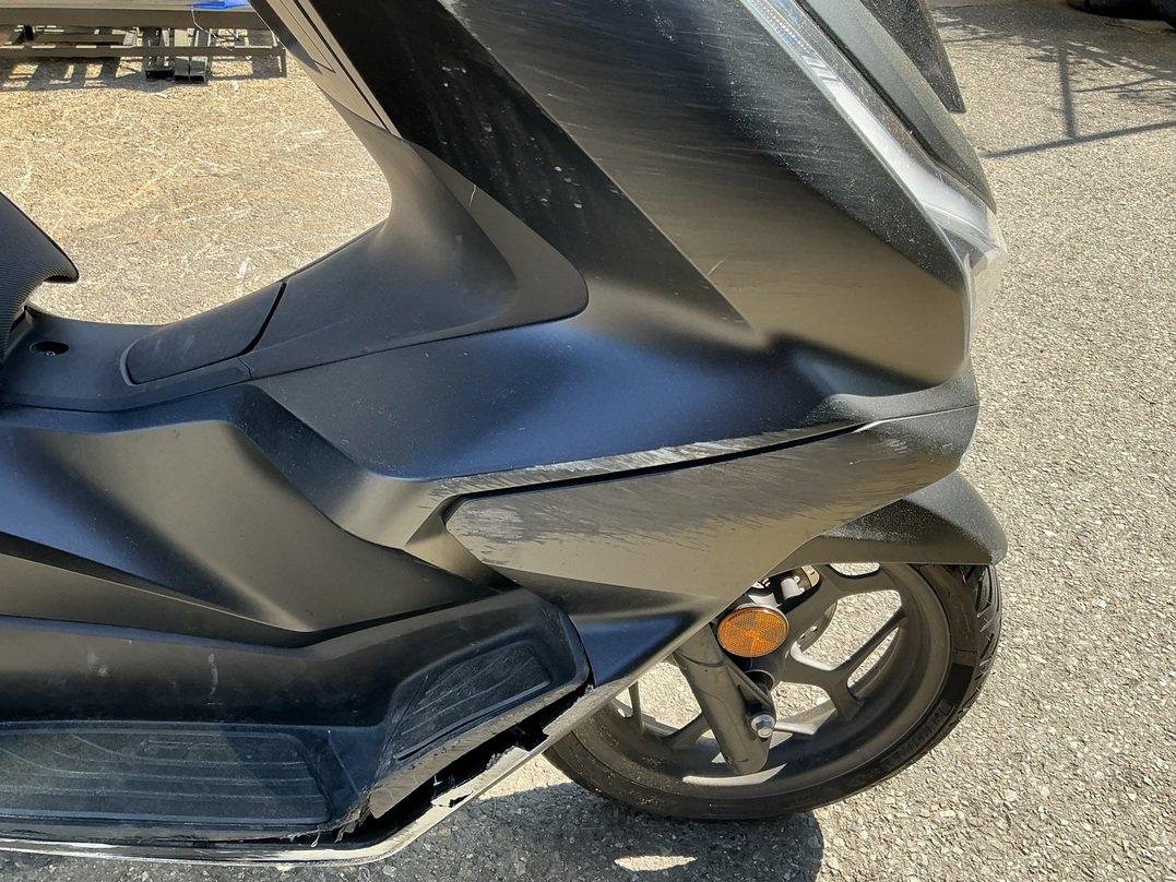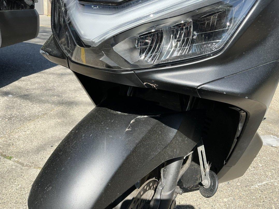 Collision animale : choc avant et chute sur le côté droit Pare-boue avant cassé Carénages avant cassés Feu avant griffé Carénages, côté droit, râpés Echappement râpé Levier de frein râpé