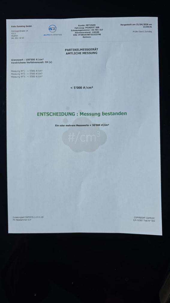 Dieselpartikelfiltertest wurde erfolgreich durchgeführt (Schriftlicher Ausdruck ist vorhanden).
