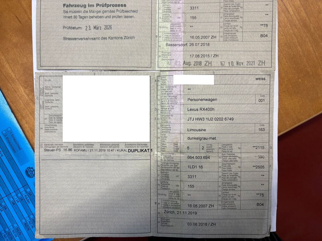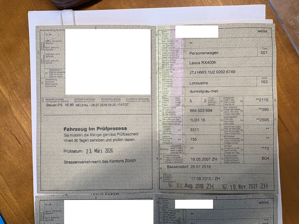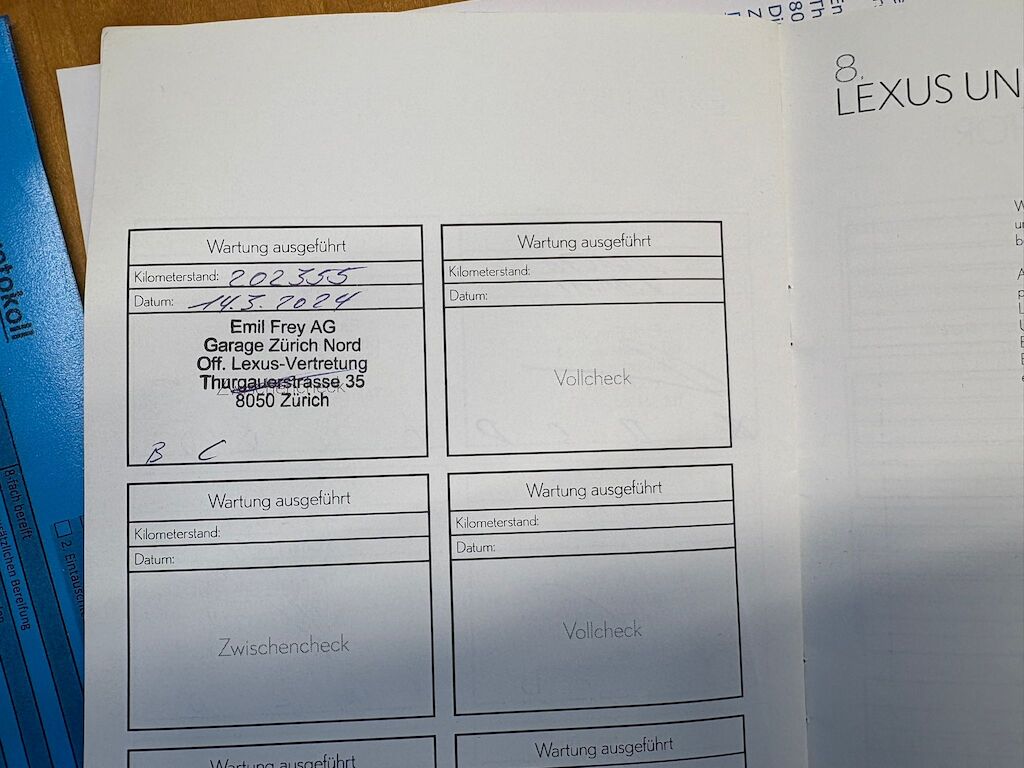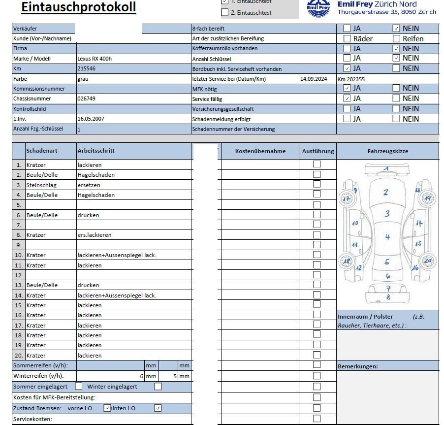 Keine Gewähr auf die Angaben der Sonder- und Serienausstattung / keine mechanische Prüfung. Fahrzeug wurde unzerlegt expertisiert / keine Haftung für allfällige, nach Demontage bekanntwerdenden Mängel. Fahrzeugbereifung und Ausstattung gemäss Fotos / Fahrzeugkauf auf eigenes Risiko ab Platz ohne Nachwährschaft.- Div. Dellen und Kratzer am gesamten Fahrzeug.- Mehrere Steinschläge auf der Frontscheibe.- Antenne Hagelschäden und abgeknabbert.- Hagelschäden auf dem Dach und Motorhaube.- MFK nicht bestanden.- Radlager hinten machen Geräusche.- Radlager vorne links und rechts ersetzen.- Querlenker links und rechts ersetzen.- Antriebswellenmanschette rechts innen.- Alle Felgen haben diverse Kratzerersetzen.- Letzter Service am 14.09.2024 bei 202'355 Km.
