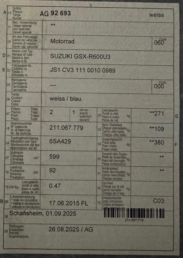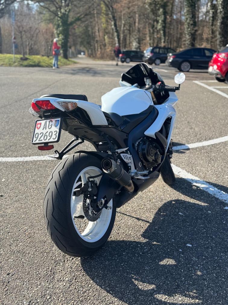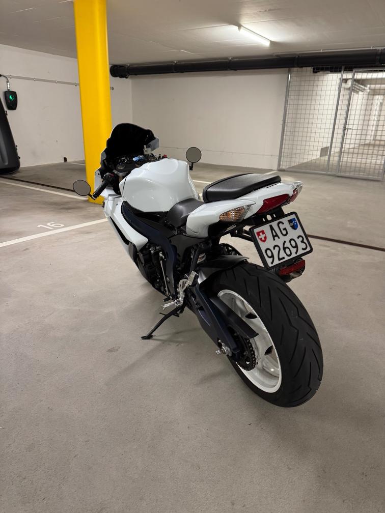 Kundenfahrzeug: Suzuki GSX-R 600 – gepflegt, wenig km, idealer Zustand Zu verkaufen ist meine Suzuki GSX-R 600, Jahrgang 2015, mit nur ca 12'000 km. Das Motorrad befindet sich seit 2021 in meinem Besitz, wurde stets sorgfältig behandelt und nur wenig gefahren. Technisch in gutem Zustand, läuft sauber, schaltet einwandfrei und macht viel Freude. Ölservice sowie Bremsflüssigkeit wurden jährlich gemacht. MFK im Sommer 2025, seither nur wenig bewegt. Ausstattung / Zubehör: Scorpion Endschalldämpfer Verstellbare Brems- und Kupplungshebel Verdunkelte Puig Racing-Scheibe Beide Motorsteuergeräte vorhanden: 25 kW und 92 kW Hinweise: Alters- und gebrauchsübliche Spuren vorhanden Frühere kosmetische Instandsetzung auf der linken Seite ersichtlich, ohne Einfluss auf Funktion oder Fahrverhalten Vorderreifen ca 5 jahre, Hinterreifen 2 jährig Sehr schönes und zuverlässiges Motorrad mit tiefem Kilometerstand. Ideal für Einsteiger (25 kW) oder offen fahrbar mit 92 kW.