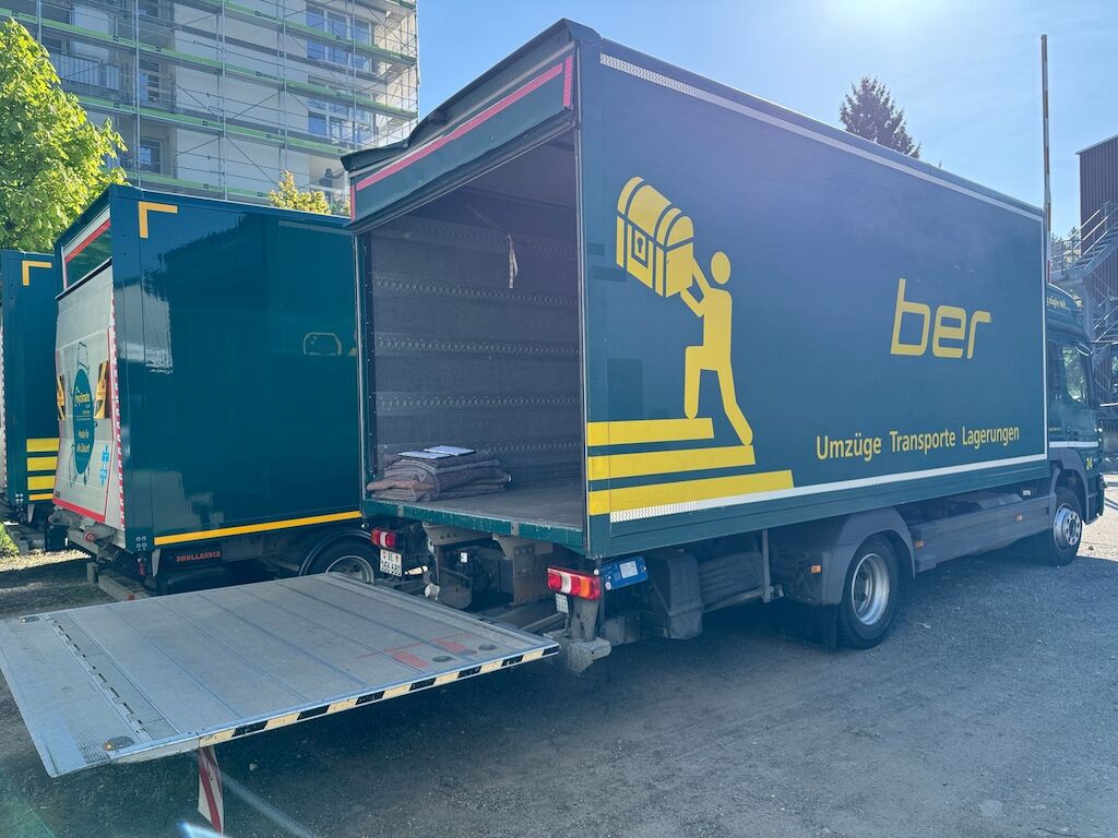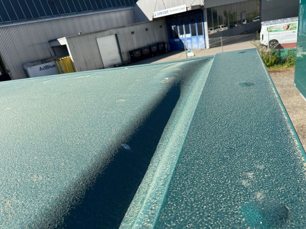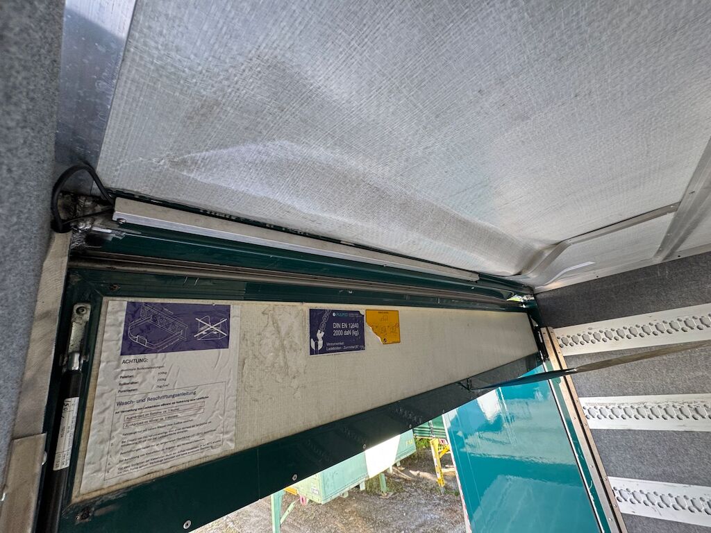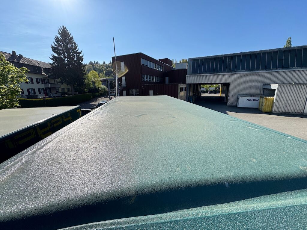 Kollision mit Beschädigung von Kastenaufbau hinten oben und Dachkonstruktion innen sowie Dachabdeckung und Rhinodachbeschichtung aussen und Beschriftung. Motor Getriebe Vorderachse Hinterachse Airbags ausgelöst: 0 Nein ( Abfallcode 16.01.04ak )