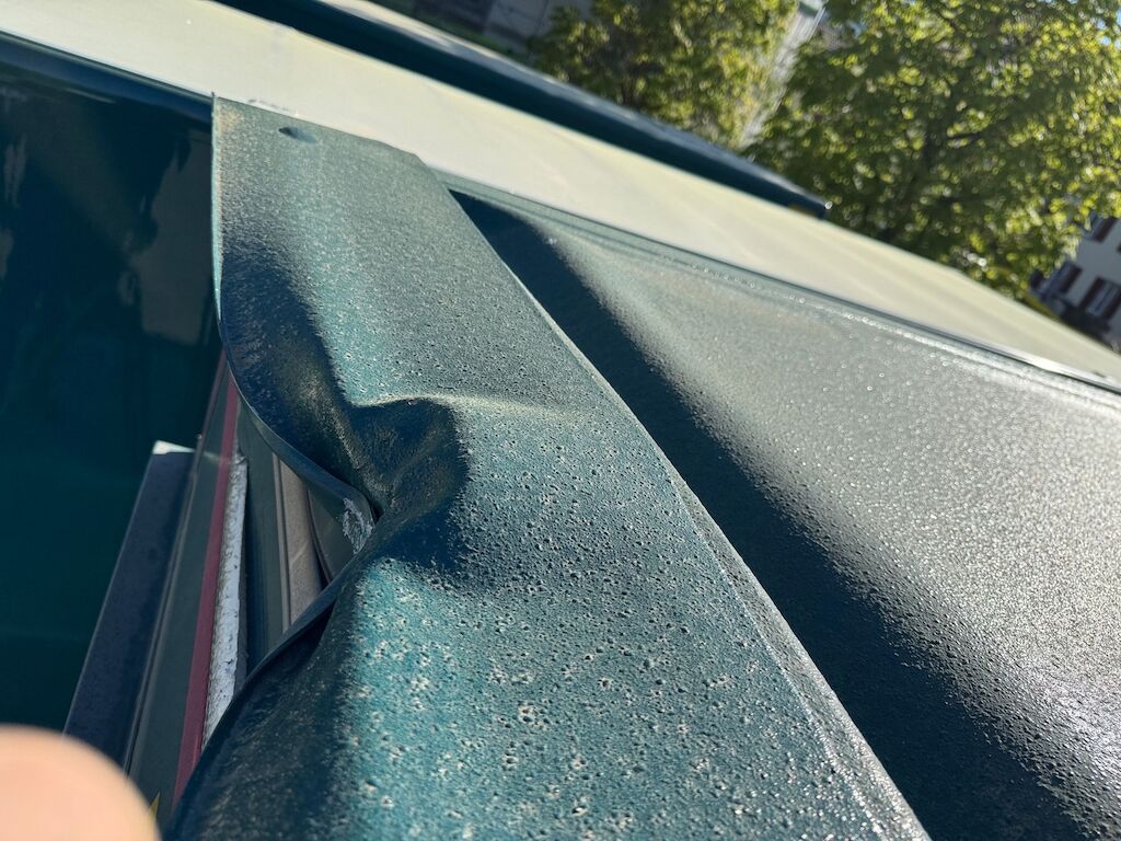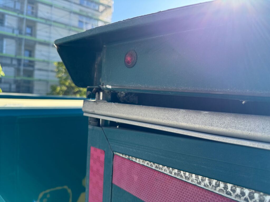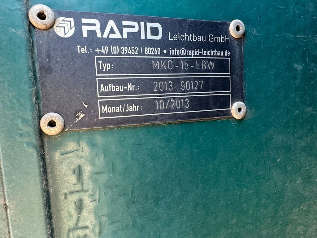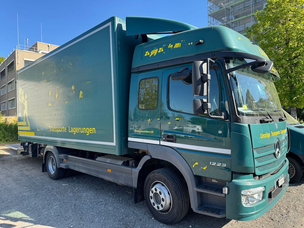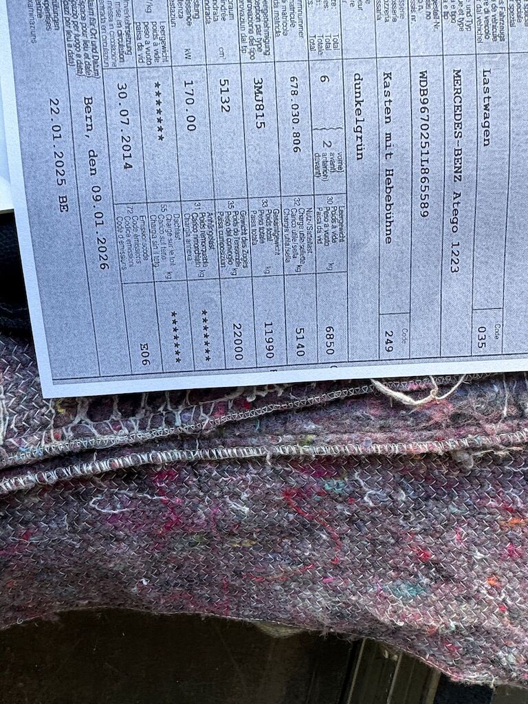 Kollision mit Beschädigung von Kastenaufbau hinten oben und Dachkonstruktion innen sowie Dachabdeckung und Rhinodachbeschichtung aussen und Beschriftung. Motor Getriebe Vorderachse Hinterachse Airbags ausgelöst: 0 Nein ( Abfallcode 16.01.04ak )